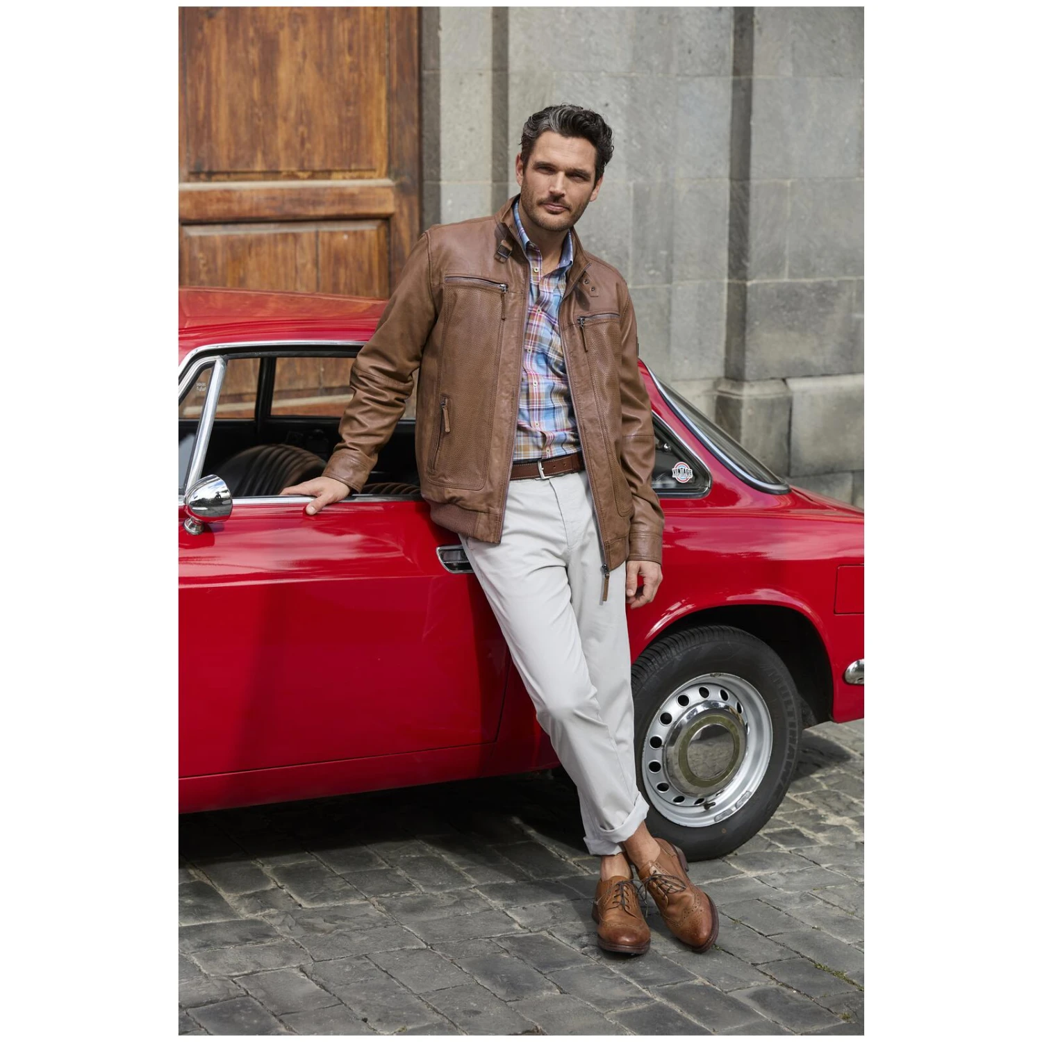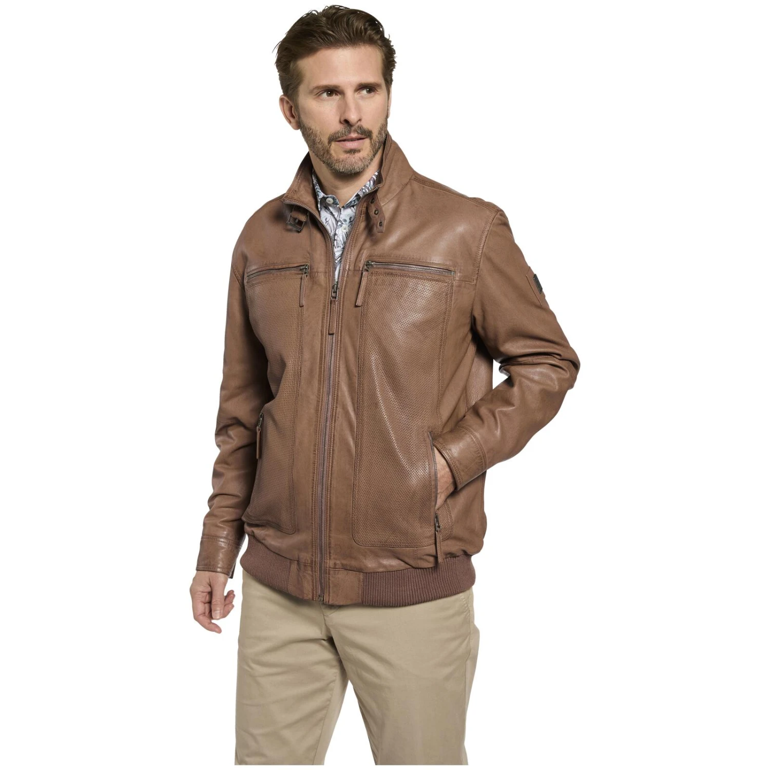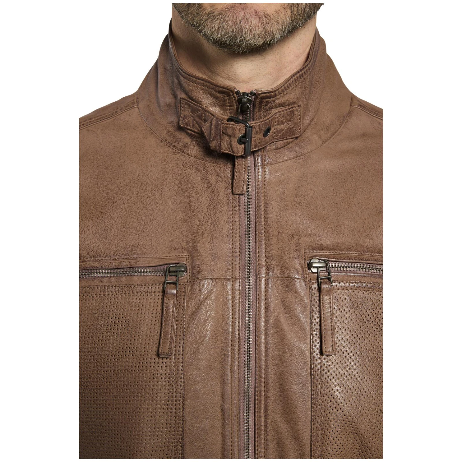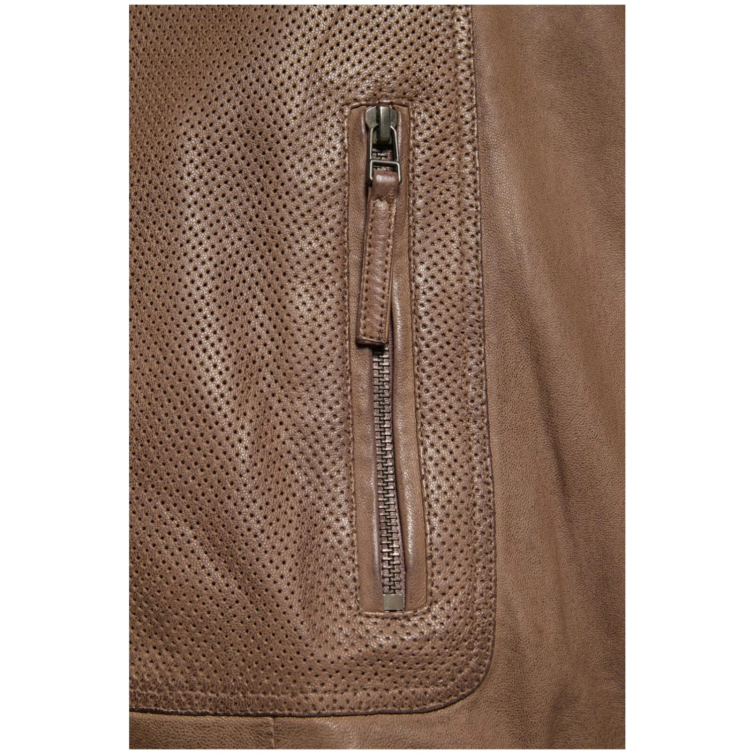 Ein Kunstwerk von bester Qualität: Das ist Lederjacke CORIETTA. Die feine Jacke aus echtem Lammnappa überzeugt unter anderem durch seine Perforierung an der Vorderseite. Die praktischen Taschen ergänzen das stilvolle Gesamtbild, und auch an der Innenseite finden sich weitere Taschen. Der schicke Stehkragen mit modischer Schnalle bringt einen Hauch von Lässigkeit ein. Bequem und unkompliziert ist das Schmuckstück dank des Reißverschlusses und dem gemütlichen Bund aus Rippstrick. Ein Metallbadge am Ärmel ist ein weiteres hochwertiges Detail. In Lederjacke CORIETTA ist Ihnen also ein geschmackvoller Look garantiert.