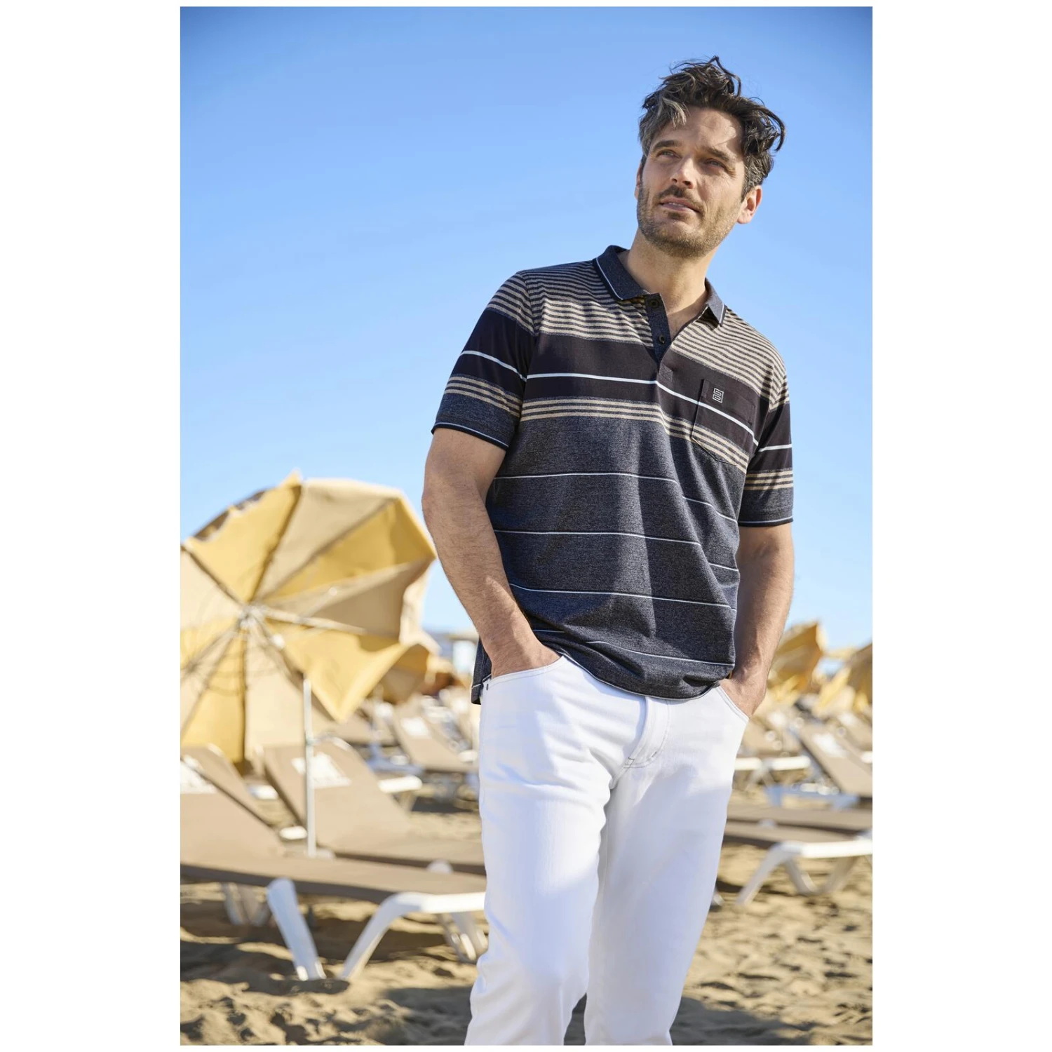 Hier kommt Poloshirt GIVITO: Ein Shirt wie der Mond, der am Himmel über dem Meer steht. Der Polokragen und die hochwertig bestickte Brusttasche auf der linken Seite bilden den gepflegten Rahmen für das maritime Design. Das mehrfarbige Muster mit Querstreifen findet an der Brust und der Schulterpartie seinen stilvollen Höhepunkt. Die Stay Fresh-Ausrüstung macht das Oberteil dazu bügelfrei, hautsympathisch sowie pflegeleicht und immer wieder aufs Neue zu einer malerischen Option für Ihren Look. Poloshirt GIVITO verleiht Ihrem Outfit eine kunstvolle Note.