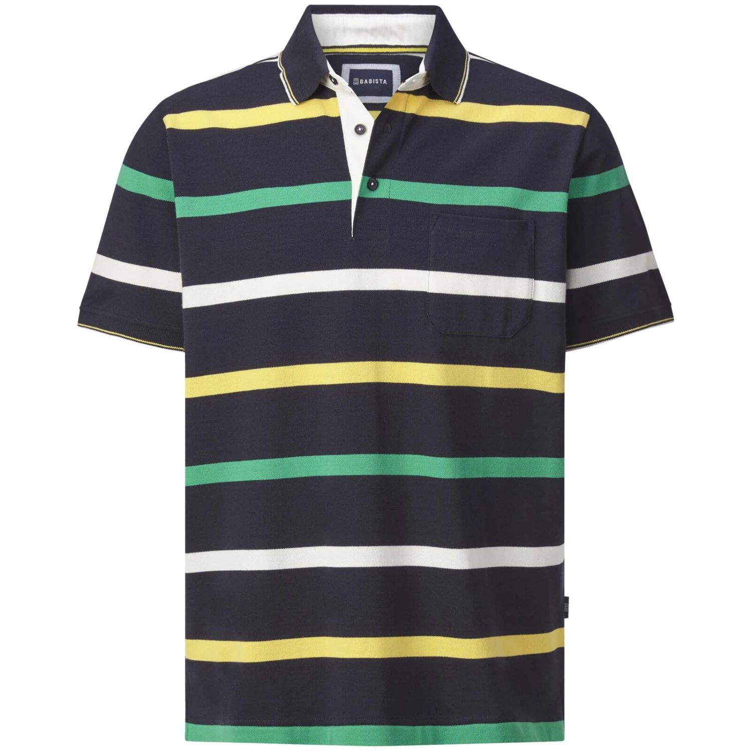 Das Poloshirt RIVENTO ist absolut sportlich und schick. Das Shirt hat einen Polokragen mit Knopfleiste für einen dynamischen Look. Eine Brusttasche links ist ein praktisches Detail. Seitenschlitze sorgen unterdessen für optimale Bewegungsfreiheit, damit Sie es zu jeder Zeit bequem haben. Das Muster aus mehrfarbigen Streifen macht das Shirt zum besonderen Hingucker und bringt Sie zum Strahlen. Eine Markenflag an der linken Seite ist ein hochwertiges Extra. Das macht Poloshirt RIVENTO zu einem rundum perfekten Oberteil für stilvolle Tage.