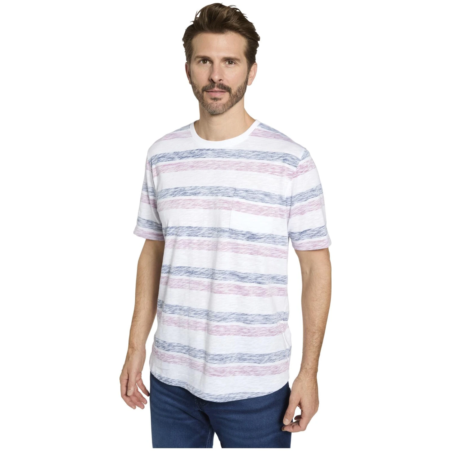 T-Shirt HALENTO passt einfach immer. Das lässige Shirt hat einen ganz klassischen Rundhalsausschnitt für einen schlichten und stilvollen Look. Eine Brusttasche auf der linken Seite bietet auf funktionelle Weise Platz für Kleinigkeiten. Das Muster aus Streifen in mehreren Farben in blasser Optik gibt dem Oberteil seinen dezenten Chic. In T-Shirt HALENTO sind Sie also die gesamte warme Jahreszeit sorglos voller Stil gekleidet.